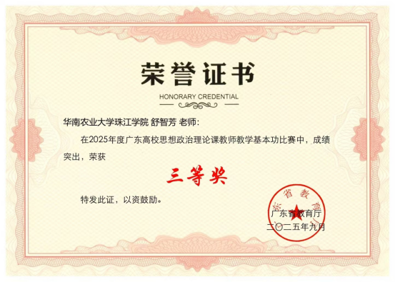 近日,2025年度广东高校思想政治理论课教师教学基本功比赛结果揭晓,我院舒智芳老师凭借出色表现,荣获三等奖。