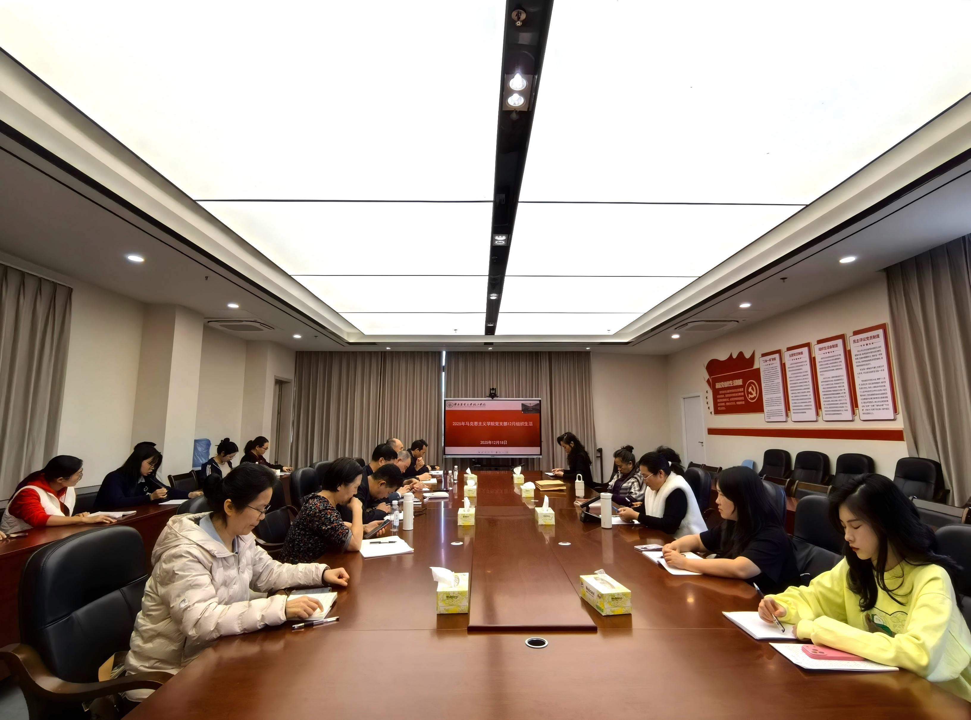 为进一步加强党员政治理论学习,强化理论武装,筑牢思想根基,12月18日下午,马克思主义学院党支部在1-401会议室组织开展12月份组织生活,就“学习贯彻党的二十届四中全会精神”;“学习习近平总书记在广东考察时的重要讲话精神”;“学习习近平总书记重要文章《推进党的自我革命要做到‘五个进一步到位’》”;“《习近平谈治国理政》第五卷”;“《习近平经济思想概论》”等内容开展学习。常驻四会校区的7名党员教师同步通过线上参会。许祝书记主持本次会议,全体党员教师参加会议。